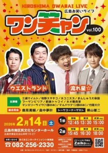 広島お笑いライブ ワンチャン。2月14日(土)、100回記念です