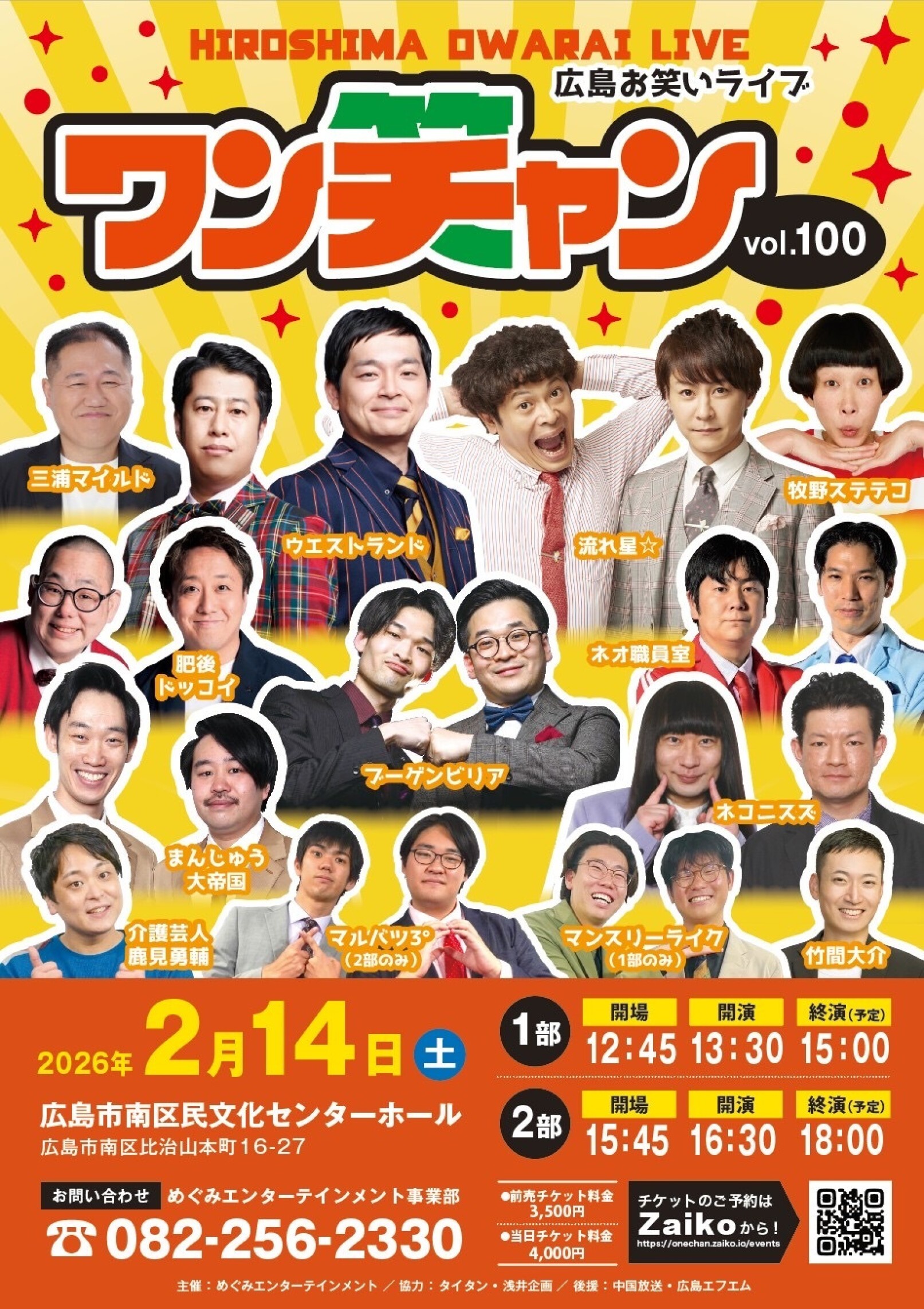 広島お笑いライブ ワンチャン。2月14日(土)、100回記念です